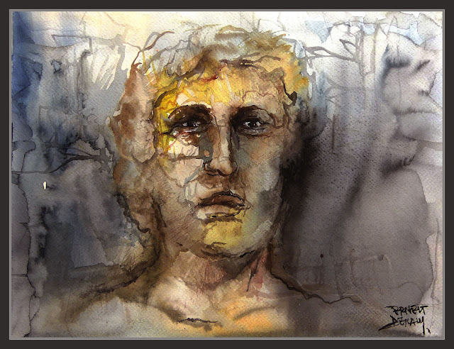 Hoy muestro las obras con el retrato de Alejandro, el eterno insatisfecho, sus metas eran inalcanzables en nuestro mundo terrenal, el gran Rey aspiraba a la Inmortalidad, y la consiguió pues creó un Nuevo Orden Mundial que aún mantiene toda su vigencia con fuerte influencia en la política de muchas naciones y de los siglos que siguieron a su muerte en Babilonia, con una pintura de retrato expresivo me siento muy satisfecho, la siguiente acuarela trata sobre la llegada del ejército macedonio a las montañas nevadas del lejano PAROPAMISO, la cumbre del mundo en Afganistán y Pakistán, nuevas experiencias en un continuado viaje de persecución al Rey de Reyes Darío, que pronto sería víctima de la traición y asesinato de manos de sus sátrapas persas, luego el traidor BESSOS sería arrestado y sometido a la justicia, con pena de descuartizamiento entre dos árboles que al soltarlos de sus amarres partieron el cuerpo, anteriormente mutilado, del asesino.